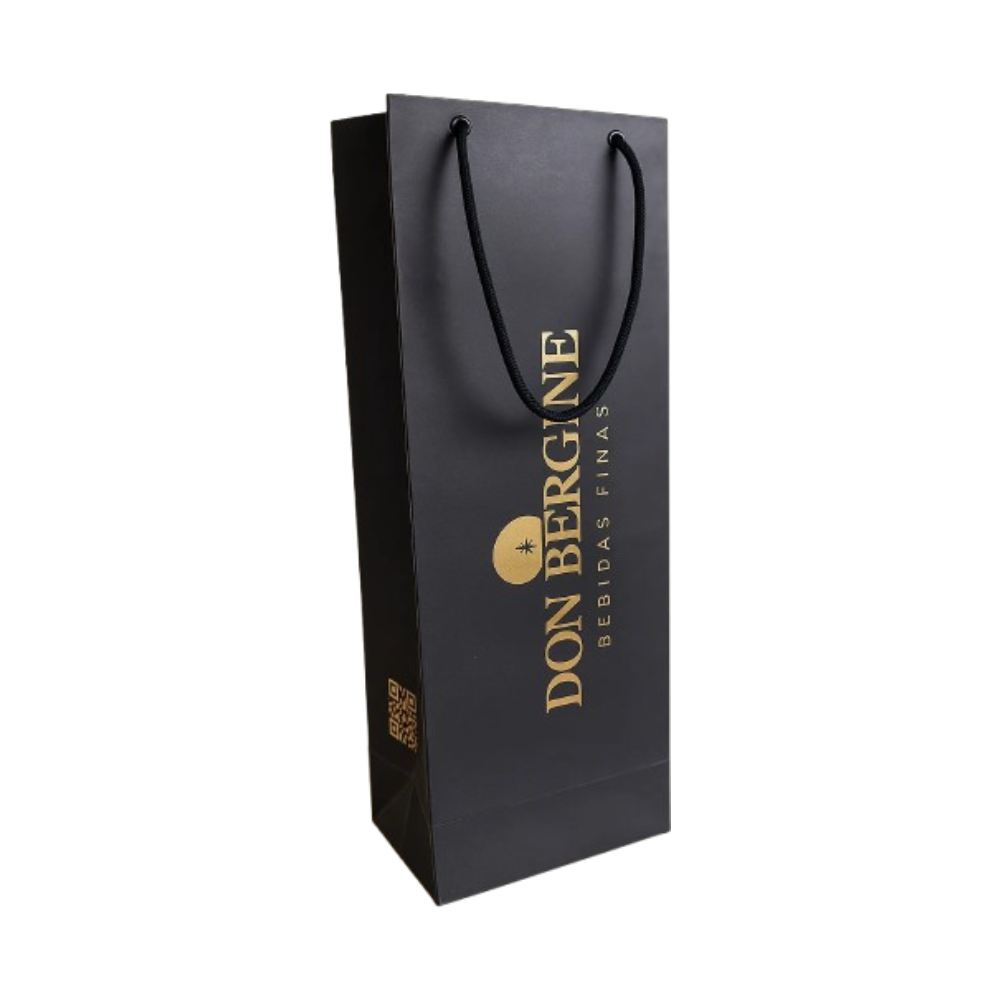 Sacola premium de papel reforçado, com fundo na cor preto fosco e logomarca em dourado brilhoso. Ideal para quem quer presentear a garrafa.